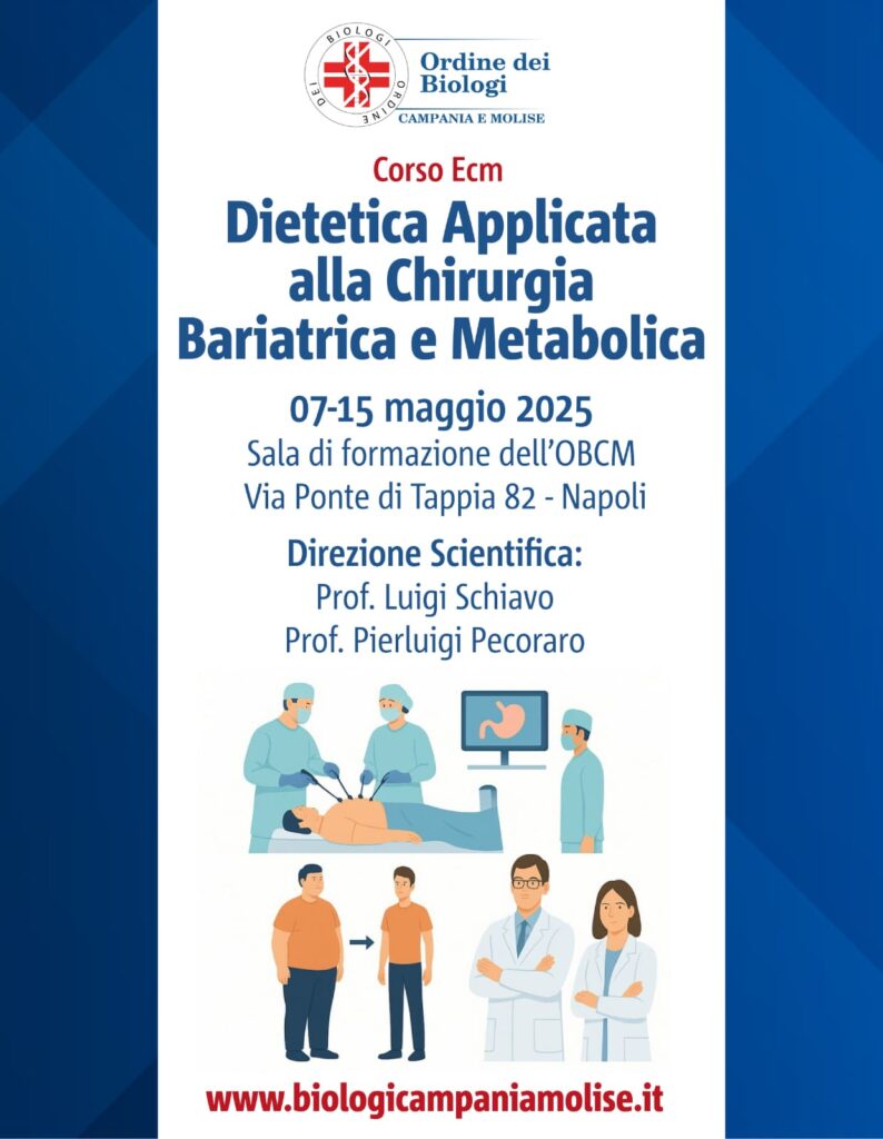 “Dietetica Applicata alla Chirurgia Bariatrica e Metabolica“: è questo il titolo del corso organizzato dall’Ordine dei Biologi della Campania e del Molise, riservato alla platea dei propri iscritti, in programma nelle giornate del 7 e del 15 maggio 2025.