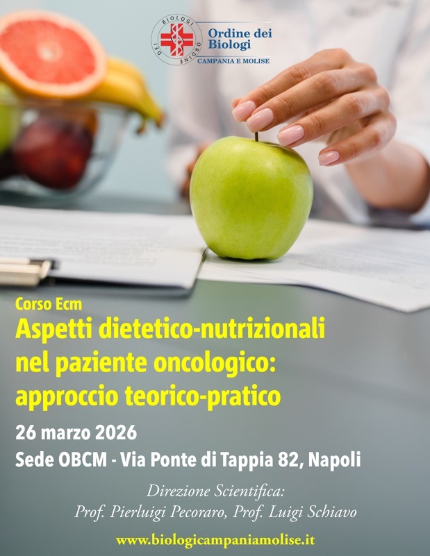 Aspetti dietetico-nutrizionali nel paziente oncologico: approccio teorico-pratico“. E’ il titolo del corso ECM in programma il prossimo 26 marzo a Napoli, nella sede dell’Ordine dei Biologi della Campania e del Molise (OBCM), in via Ponte di Tappia, 83. L’evento, organizzato dall’OBCM, è affidato alla direzione scientifica dei prof.ri Pierluigi Pecoraro e Luigi Schiavo, entrambi consiglieri del Direttivo dell’Ordine (Pecoraro è anche vicepresidente dell’Ente con delega alla Nutrizione).