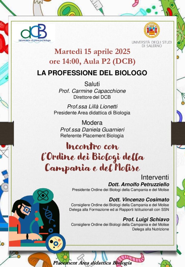 La professione del Biologo” è il tema dell’incontro di orientamento in ingresso e placement, a cura del Corso di Studio di Biologia dell’Università di Salerno, che prevede anche la partecipazione dei rappresentanti dell’Ordine dei Biologi della Campania e del Molise. L’evento, in programma il prossimo martedì 15 aprile (a partire dalle ore 14), nell’Aula P2 del Dipartimento di Chimica e Biologia (DCB) dello stesso ateneo, prevede gli interventi, per i saluti, del prof. Carmine Capacchione, direttore del DCB e della prof.ssa Lillà Lionetti, presidente Area didattica di Biologia. Modererà la prof.ssa Daniela Guarnieri, referente Placement Biologia. A seguire l’incontro con i rappresentanti dell’OB Campania-Molise: dott. Arnolfo Petruzziello, presidente dell’OBCM; dott. Vincenzo Cosimato, consigliere dello stesso Ordine territoriale (con delega alla Formazione ed ai Rapporti Istituzionali con il SSN) e prof. Luigi Schiavo, a sua volta consigliere dell’OBCM (con delega alla Nutrizione).